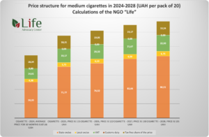 According to the calculations of experts of the NGO “Life”, in 2025 the price of a pack of cigarettes (20 pieces) may increase to UAH 115, in 2026 – to UAH 122, in 2027 – to UAH 130, and to UAH 135 in 2028.