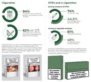 Researchers also found that combined (pictorial + text) health warnings on smoking tobacco products, implemented from July 11, 2024, are highly effective: 94% of smokers notice such warnings, and 62% of smokers were motivated to take steps toward quitting. Among users of heated tobacco products, 74% notice text warnings, but only 44.5% have considered quitting.