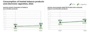 “Compared to December 2023, the share of those consuming tobacco or nicotine products has decreased from 30% to 27%. In 2022, this figure was 32%. This suggests a trend of decreasing tobacco and nicotine consumption among the adult population. We also observe a decrease in traditional cigarette consumption, while the use of emerging tobacco and nicotine products is on the rise. Overall, younger respondents are more likely to smoke”, said Victoriia Zakhozha, Deputy Director of the Kyiv International Institute of Sociology.