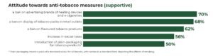 The vast majority of respondents support banning advertising of electronic smoking devices and e-cigarettes (70%) and banning the visible display of tobacco product packages in points of sale (68%). Two-thirds of respondents support banning flavored tobacco products (62%), and more than half support raising excise taxes on tobacco products and e-cigarette liquids (56%). The introduction of plain packaging is supported by 50% of respondents.
