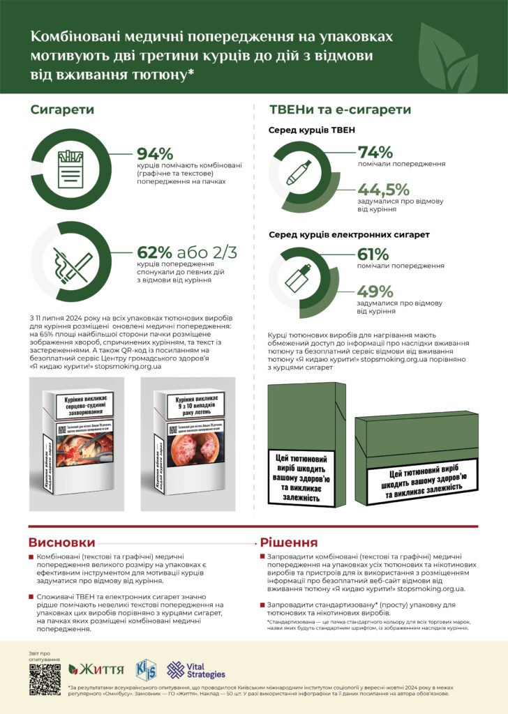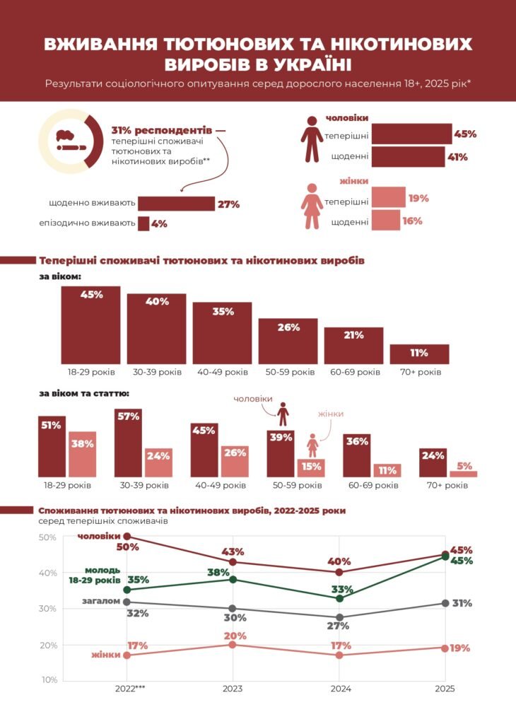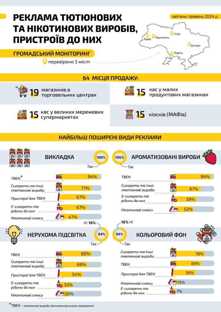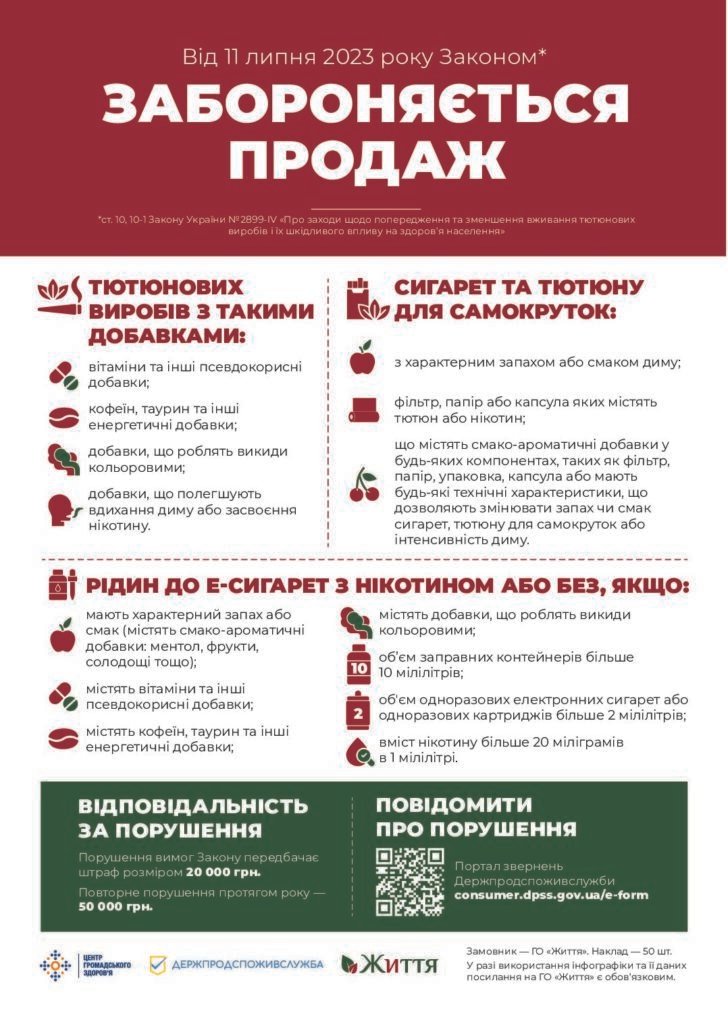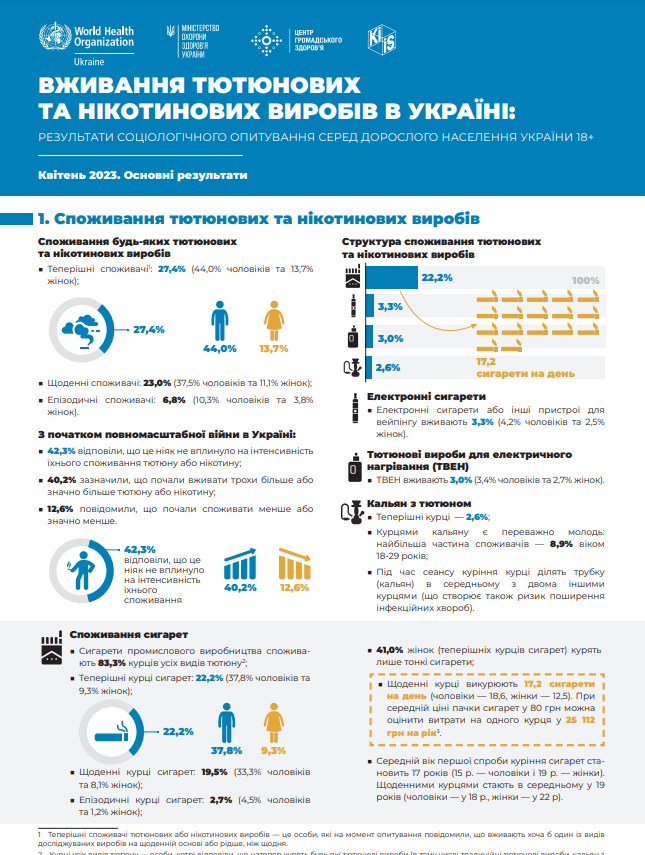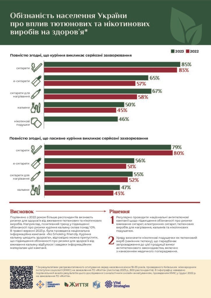 Інфографіки Українці підтримують обовʼязкове використання сертифікованих мотошоломів Нікотинові снюси – загроза для дітей, непомітна для батьків Підвищення тютюнових акцизів – гроші на перемогу Фінансово-економічна оцінка результатів впровадження Регламенту щодо безпеки мотошоломів ЕСЕ №22.06 Вживання тютюнових та нікотинових виробів серед дорослих в Україні, ВООЗ, 2024 Глобальне опитування молоді щодо тютюну, 2023 Безпечний шолом рятує життя Реклама тютюнових виробів та електронних сигарет у соціальних медіа Вживання тюютнових та нікотинових виробів (теперішні споживачі) Практики вживання тютюну та нікотину серед підлітків, 2024 Вживання тютюнових та нікотинових виробів серед населення України 18+, 2025 Маркетингові пастки тютюнової індустрії. Результати соціологічного опитування, 2025 Безпечний шолом рятує життя Опитування водіїв мотоциклів та мопедів Як тютюнова індустрія отруює довкілля Моніторинг закладів ресторанного господарства, 2025 Тютюнові акцизи в Україні у 2013-2024 роках Податкова преференція для ТВЕН – неприпустима! Вживання тютюнових та нікотинових виробів 18+, 2024 Реклама тютюнових та нікотинових виробів 18+, 2024 Ефективність комбінованих медичних попереджень, 2024 Вживання тютюнових та нікотинових виробів, КМІС, 2024 Основні положення законопроєкту №12091 Моніторинг реклами тютюнових та нікотинових виробів у місцях торгівлі Результати соціологічного опитування серед дорослого населення України у межах проведення дослідження Омнібус. Грудень 2023 Оцінка ефективності інформаційної кампанії «Стань на варті свого серця», проведеної у 2023 році Інфографіка «Обізнаність населення України про вплив тютюнових та нікотинових виробів на здоров’я» Структура ціни сигарет (грн/пачка). Чинний план VS додаткове підвищення Структура ціни сигарет для нагрівання (грн/пачка). Чинний план VS додаткове підвищення Тютюнові акцизи в Україні у 2013-2025 роках. Прогноз на 2024-2025 рр. за умов чинного плану та додаткового підвищення Тютюнова вітрина — пастка для дитини. Чому потрібно заборонити сигаретну викладку Інфографіка про заборону смако-ароматичних добавок до сигарет та рідин до е-сигарет Інфографіка про заборону реклами, стимулювання продажу та спонсорства тютюнових та нікотинових виробів Інфографіка: Вживання тютюнових та нікотинових виробів в Україні Активне і пасивне куріння кальяну шкодить вашому здоров'ю Громадський моніторинг дотримання заборони куріння у приміщеннях закладів ресторанного господарства Тютюнові компанії полюють на дітей. Результати дослідження Університету Джона Хопкінса, 2016 р. Тютюнове тіло. Дослідження ВООЗ Маркування електронних сигарет, заправних контейнерів та рідин до них Маркування трав'яних виробів для куріння Маркування тютюнових виробів для куріння Маркування бездимних тютюнових виробів Маркування бездимних тютюнових виробів Інфографіка для сімейних лікарів про тестування та вакцинацію від Covid-19 Результати опитування КМІС щодо ставлення населення України до антитютюнових заходів у 2022 році Інформація для суб'єктів господарювання усіх форм власності Інформація для закладів ресторанного господарства Що робити, якщо вас обкурюють? Тютюнові акцизи в Україні у 2013-2021 роках Доповідь ВООЗ про глобальну епідемію тютюну 2021 Законопроєкт 4358 Комплексний антитютюновий законопроєкт №4358: друге чи