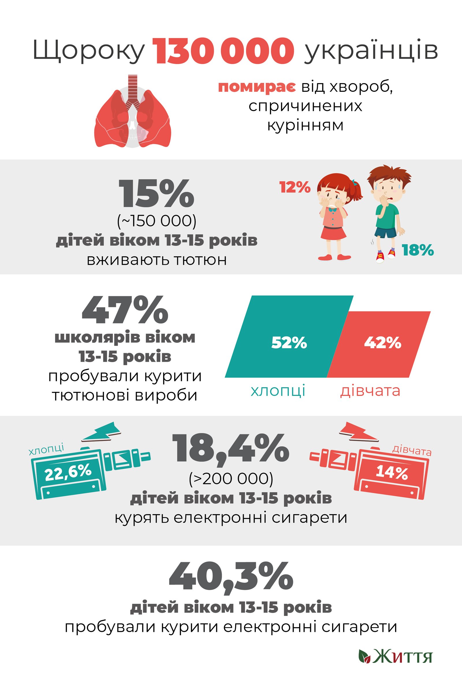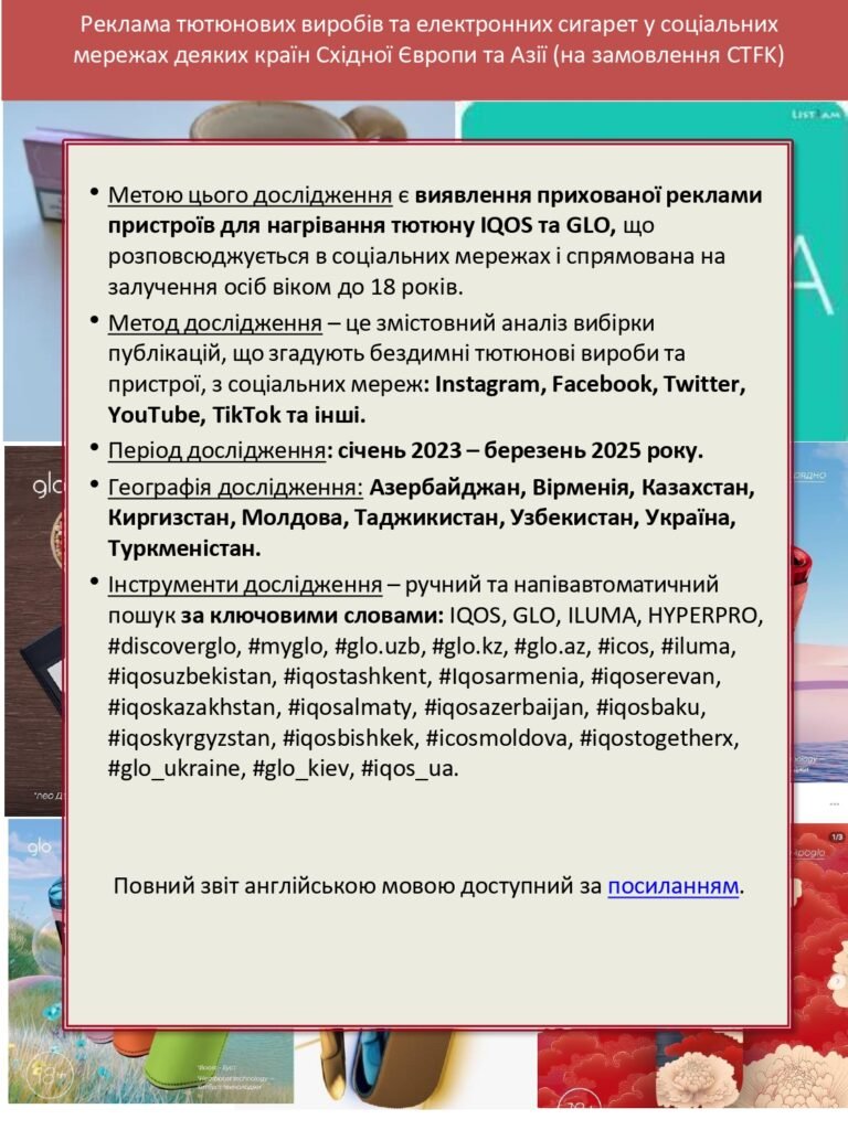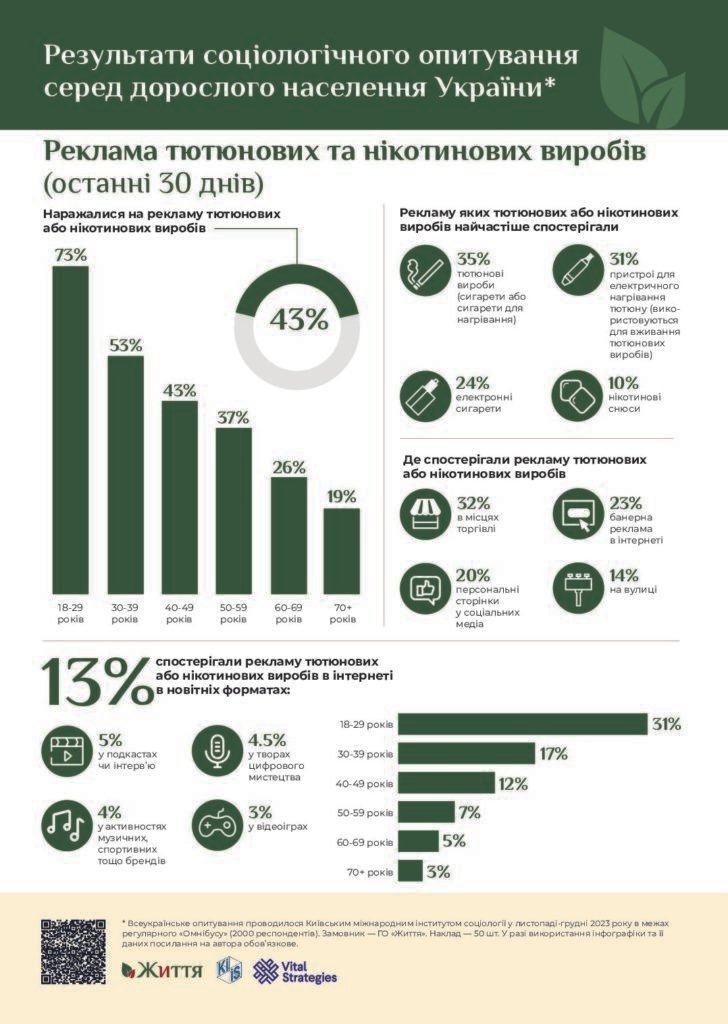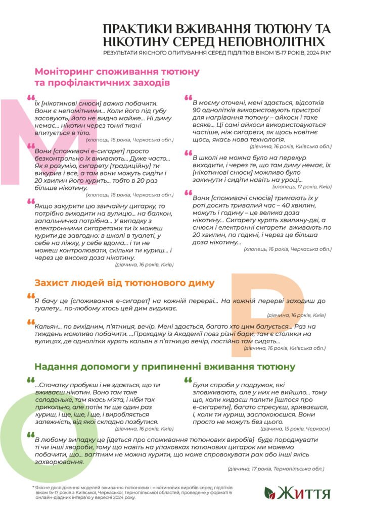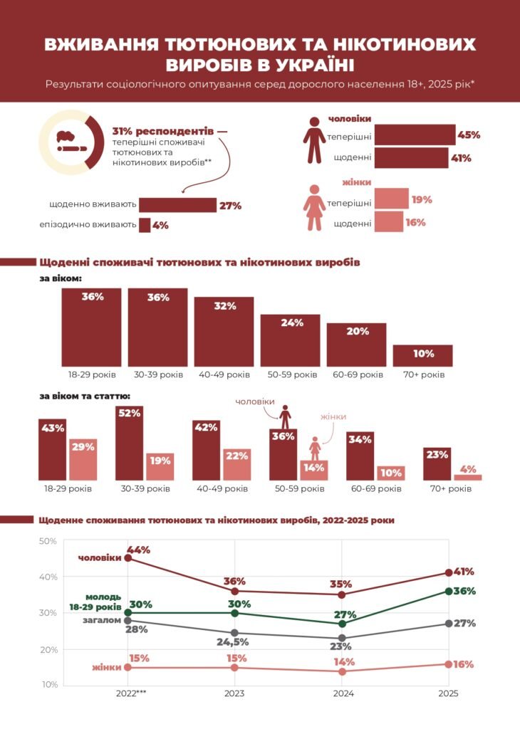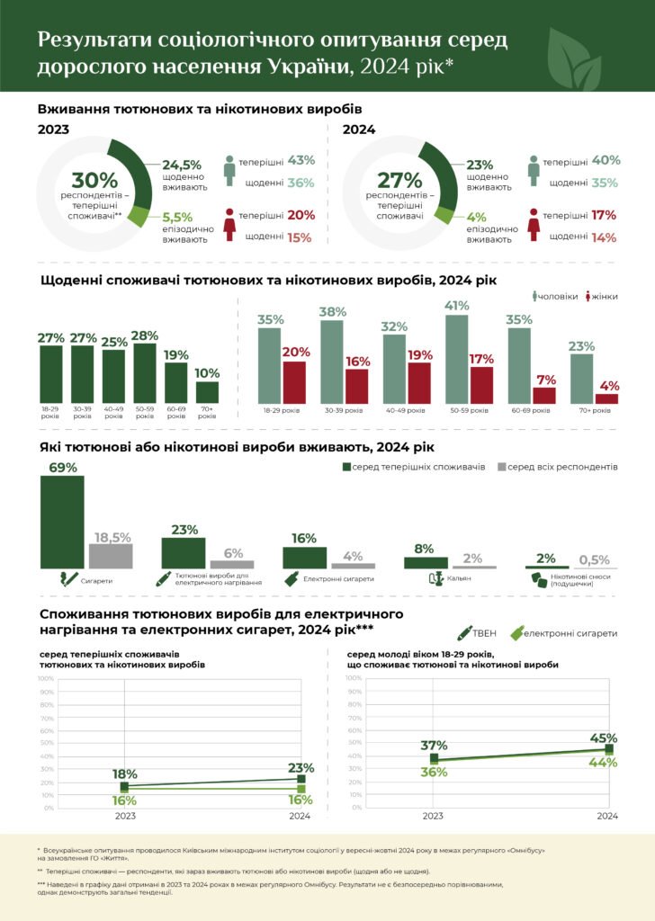 Інфографіки Українці підтримують обовʼязкове використання сертифікованих мотошоломів Нікотинові снюси – загроза для дітей, непомітна для батьків Підвищення тютюнових акцизів – гроші на перемогу Фінансово-економічна оцінка результатів впровадження Регламенту щодо безпеки мотошоломів ЕСЕ №22.06 Вживання тютюнових та нікотинових виробів серед дорослих в Україні, ВООЗ, 2024 Глобальне опитування молоді щодо тютюну, 2023 Безпечний шолом рятує життя Реклама тютюнових виробів та електронних сигарет у соціальних медіа Вживання тюютнових та нікотинових виробів (теперішні споживачі) Практики вживання тютюну та нікотину серед підлітків, 2024 Вживання тютюнових та нікотинових виробів серед населення України 18+, 2025 Маркетингові пастки тютюнової індустрії. Результати соціологічного опитування, 2025 Безпечний шолом рятує життя Опитування водіїв мотоциклів та мопедів Як тютюнова індустрія отруює довкілля Моніторинг закладів ресторанного господарства, 2025 Тютюнові акцизи в Україні у 2013-2024 роках Податкова преференція для ТВЕН – неприпустима! Вживання тютюнових та нікотинових виробів 18+, 2024 Реклама тютюнових та нікотинових виробів 18+, 2024 Ефективність комбінованих медичних попереджень, 2024 Вживання тютюнових та нікотинових виробів, КМІС, 2024 Основні положення законопроєкту №12091 Моніторинг реклами тютюнових та нікотинових виробів у місцях торгівлі Результати соціологічного опитування серед дорослого населення України у межах проведення дослідження Омнібус. Грудень 2023 Оцінка ефективності інформаційної кампанії «Стань на варті свого серця», проведеної у 2023 році Інфографіка «Обізнаність населення України про вплив тютюнових та нікотинових виробів на здоров’я» Структура ціни сигарет (грн/пачка). Чинний план VS додаткове підвищення Структура ціни сигарет для нагрівання (грн/пачка). Чинний план VS додаткове підвищення Тютюнові акцизи в Україні у 2013-2025 роках. Прогноз на 2024-2025 рр. за умов чинного плану та додаткового підвищення Тютюнова вітрина — пастка для дитини. Чому потрібно заборонити сигаретну викладку Інфографіка про заборону смако-ароматичних добавок до сигарет та рідин до е-сигарет Інфографіка про заборону реклами, стимулювання продажу та спонсорства тютюнових та нікотинових виробів Інфографіка: Вживання тютюнових та нікотинових виробів в Україні Активне і пасивне куріння кальяну шкодить вашому здоров'ю Громадський моніторинг дотримання заборони куріння у приміщеннях закладів ресторанного господарства Тютюнові компанії полюють на дітей. Результати дослідження Університету Джона Хопкінса, 2016 р. Тютюнове тіло. Дослідження ВООЗ Маркування електронних сигарет, заправних контейнерів та рідин до них Маркування трав'яних виробів для куріння Маркування тютюнових виробів для куріння Маркування бездимних тютюнових виробів Маркування бездимних тютюнових виробів Інфографіка для сімейних лікарів про тестування та вакцинацію від Covid-19 Результати опитування КМІС щодо ставлення населення України до антитютюнових заходів у 2022 році Інформація для суб'єктів господарювання усіх форм власності Інформація для закладів ресторанного господарства Що робити, якщо вас обкурюють? Тютюнові акцизи в Україні у 2013-2021 роках Доповідь ВООЗ про глобальну епідемію тютюну 2021 Законопроєкт 4358 Комплексний антитютюновий законопроєкт №4358: друге чи