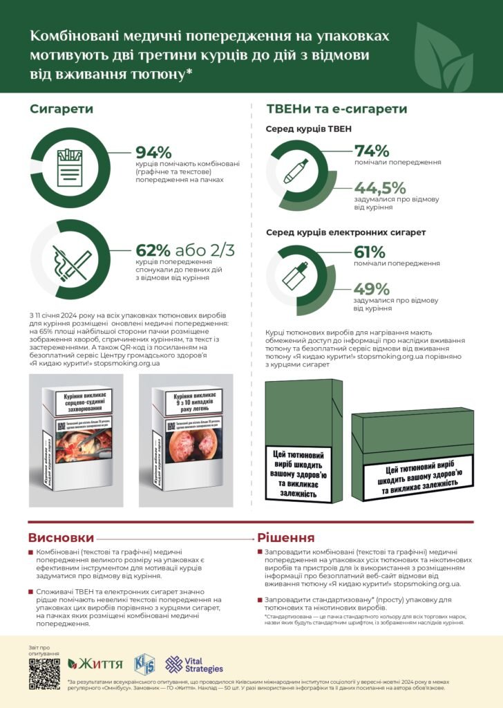 Інфографіки Тютюнові акцизи в Україні 2013-2025 роки Тютюнова індустрія полює на дітей Невідкладні кроки задля захисту дітей від тютюну та нікотину Українці підтримують обовʼязкове використання сертифікованих мотошоломів Право дітей на здоровий розвиток гарантоване законодавством Нікотинові снюси – загроза для дітей, непомітна для батьків Підвищення тютюнових акцизів – гроші на перемогу Фінансово-економічна оцінка результатів впровадження Регламенту щодо безпеки мотошоломів ЕСЕ №22.06 Вживання тютюнових та нікотинових виробів серед дорослих в Україні, ВООЗ, 2024 Глобальне опитування молоді щодо тютюну, 2023 Безпечний шолом рятує життя Реклама тютюнових виробів та електронних сигарет у соціальних медіа Вживання тюютнових та нікотинових виробів (теперішні споживачі) Практики вживання тютюну та нікотину серед підлітків, 2024 Вживання тютюнових та нікотинових виробів серед населення України 18+, 2025 Маркетингові пастки тютюнової індустрії. Результати соціологічного опитування, 2025 Безпечний шолом рятує життя Опитування водіїв мотоциклів та мопедів Як тютюнова індустрія отруює довкілля Моніторинг закладів ресторанного господарства, 2025 Тютюнові акцизи в Україні у 2013-2024 роках Податкова преференція для ТВЕН – неприпустима! Вживання тютюнових та нікотинових виробів 18+, 2024 Реклама тютюнових та нікотинових виробів 18+, 2024 Ефективність комбінованих медичних попереджень, 2024 Вживання тютюнових та нікотинових виробів, КМІС, 2024 Основні положення законопроєкту №12091 Моніторинг реклами тютюнових та нікотинових виробів у місцях торгівлі Результати соціологічного опитування серед дорослого населення України у межах проведення дослідження Омнібус. Грудень 2023 Оцінка ефективності інформаційної кампанії «Стань на варті свого серця», проведеної у 2023 році Інфографіка «Обізнаність населення України про вплив тютюнових та нікотинових виробів на здоров’я» Структура ціни сигарет (грн/пачка). Чинний план VS додаткове підвищення Структура ціни сигарет для нагрівання (грн/пачка). Чинний план VS додаткове підвищення Тютюнові акцизи в Україні у 2013-2025 роках. Прогноз на 2024-2025 рр. за умов чинного плану та додаткового підвищення Тютюнова вітрина — пастка для дитини. Чому потрібно заборонити сигаретну викладку Інфографіка про заборону смако-ароматичних добавок до сигарет та рідин до е-сигарет Інфографіка про заборону реклами, стимулювання продажу та спонсорства тютюнових та нікотинових виробів Інфографіка: Вживання тютюнових та нікотинових виробів в Україні Активне і пасивне куріння кальяну шкодить вашому здоров'ю Громадський моніторинг дотримання заборони куріння у приміщеннях закладів ресторанного господарства Тютюнові компанії полюють на дітей. Результати дослідження Університету Джона Хопкінса, 2016 р. Тютюнове тіло. Дослідження ВООЗ Маркування електронних сигарет, заправних контейнерів та рідин до них Маркування трав'яних виробів для куріння Маркування тютюнових виробів для куріння Маркування бездимних тютюнових виробів Маркування бездимних тютюнових виробів Інфографіка для сімейних лікарів про тестування та вакцинацію від Covid-19 Результати опитування КМІС щодо ставлення населення України до антитютюнових заходів у 2022 році Інформація для суб'єктів господарювання усіх форм власності Інформація для закладів ресторанного господ