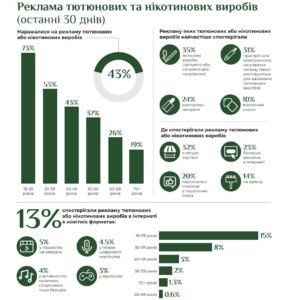 Опитування показало, що найбільше помічає рекламу тютюну та нікотину саме молоде населення — 73% молоді віком 18-29 років. Далі цей показник знижується з кожною віковою групою і падає до 19% серед респондентів у віці 70 років і старше. Це підтверджує, що реклама тютюнових та нікотинових виробів спрямована на наймолодшу вікову групу.