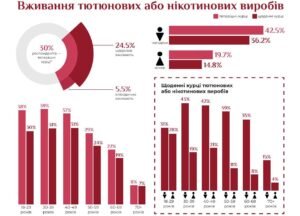 З огляду на структуру куріння, серед українок споживання тютюнових та нікотинових виробів за 7 років зросло вдвічі. За даними опитування GATS, у 2017 році 7% українок щодня споживали тютюн, 1% — електронні сигарети. На сьогодні їх уже 15%. Найчастіше тютюн та нікотин вживають молоді жінки віком 18-29 років – 37%. З них 28,4% роблять це щодня, а 8,4% — епізодично. Тобто на сьогодні фактично кожна третя дівчина залежна від нікотину.