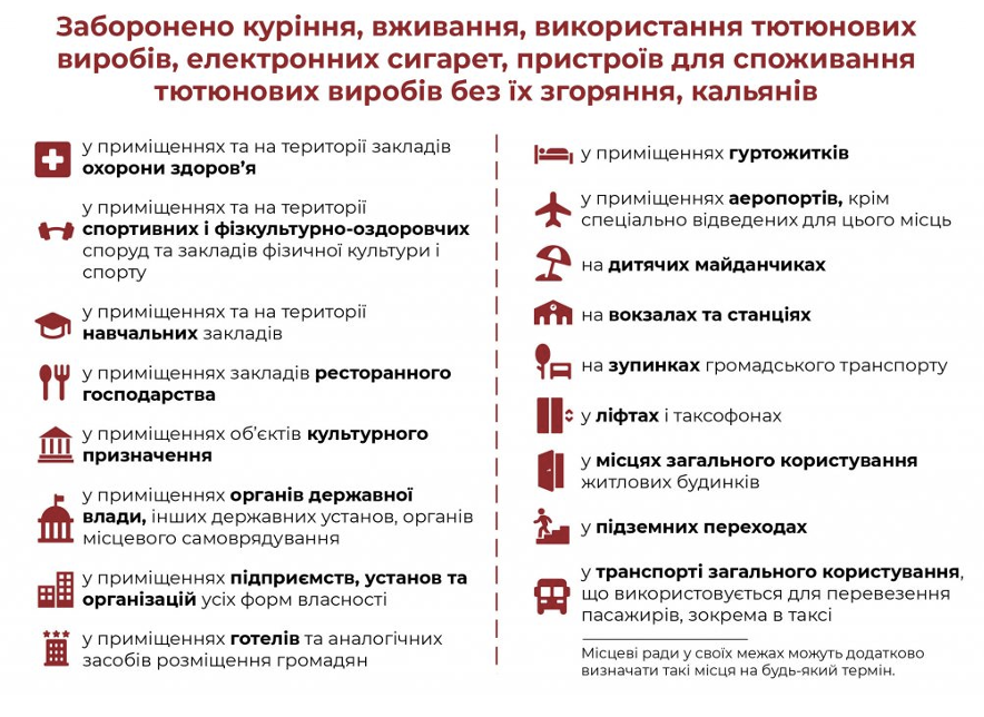 Тож заборонене будь-яке куріння, вживання та використання тютюнових виробів, кальянів, електронних сигарет і сигарет для нагрівання в приміщеннях усіх форм власності, на території спортивних та дитячих майданчиків, медичних установ, у під’їздах та підземних переходах. З повним переліком можна ознайомитися нижче: