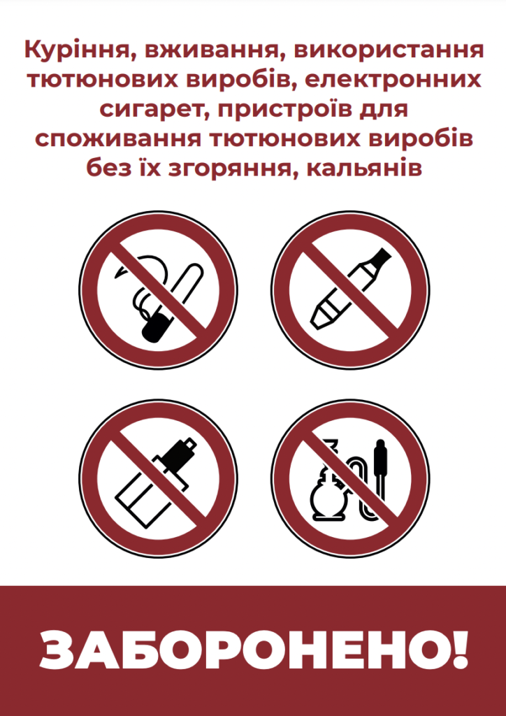 У місцях, де заборонено курити, має бути розміщений графічний знак про заборону куріння і текст «Куріння, вживання, використання тютюнових виробів, електронних сигарет, пристроїв для споживання тютюнових виробів без їх згоряння, кальянів заборонено!» Макет для друку можна завантажити за посиланням.