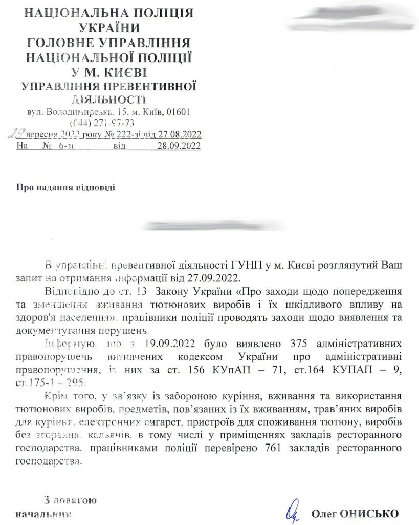 У зв’язку з цим працівники поліції проводять заходи моніторингу щодо виявлення та документування порушень ст. 13 Закону України «Про заходи щодо попередження та зменшення вживання тютюнових виробів і їх шкідливого впливу на здоров’я населення». Так з 19 вересня 2022 року у м. Києві було проведено моніторинг 761 закладу ресторанного господарства.