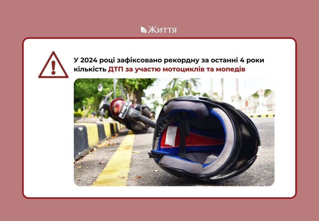 За даними Національної поліції України, у 2024 році зафіксовано рекордну за останні 4 роки кількість дорожньо-транспортних пригод (далі — ДТП) за участю мотоциклів та мопедів — 4 325 випадків із загиблими та/або травмованими. Це на 25% більше, ніж у 2023 році, що свідчить про загострення проблеми безпеки на дорогах для водіїв та пасажирів мототранспортних засобів.