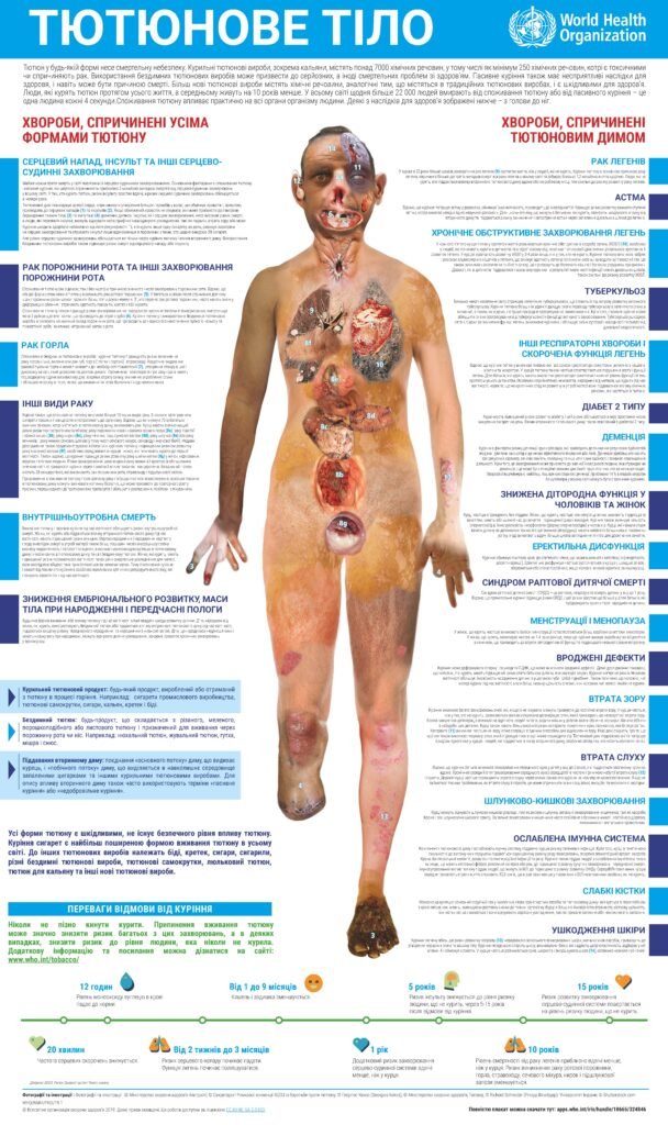Вживання тютюну викликає миттєві порушення здоров’я та підвищує ризик розвитку серцево-судинних і респіраторних захворювань, діабету та понад 20 типів раку, включаючи рак легенів, сечового міхура, гортані та ротової порожнини, протягом життя.