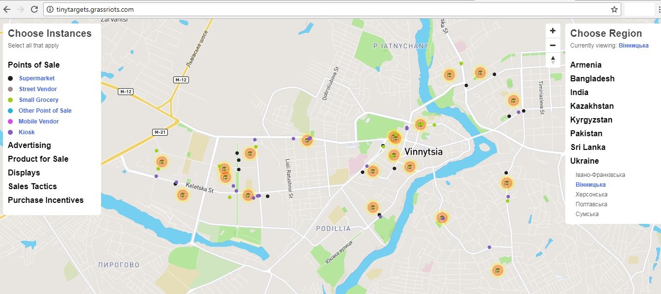 У Вінниці було перевірено 48 точок продажу у 5-ти хвилинній доступності навколо 20 шкіл. У 100% відвіданих магазинах продавалися сигарети. Моніторинг засвідчив, що 96% досліджених точок продажу використовують рекламну викладку сигарет з підсвіткою, 79% продають тютюн зі смаковими та ароматизованими добавками, у 79% місць продажу розміщують тютюнові вироби на рівні очей дитини (1 метр або нижче), у 38% – поряд із сигаретами викладають солодощі та іграшки. Ці технології єнайпоширенішими інструментами тютюнових корпорацій для стимулювання продажу своєї продукції та залучення нових курців серед дітей.