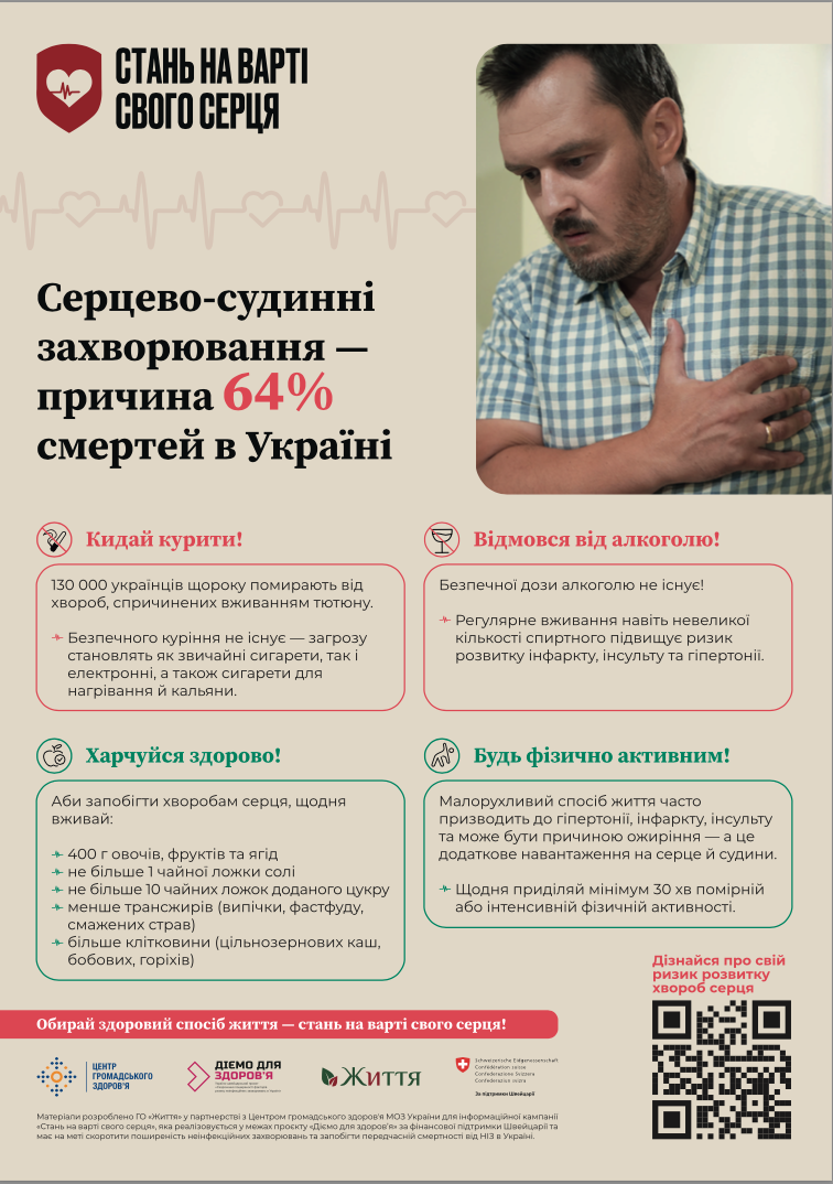 Команда громадської організації «Життя» у партнерстві з державною установою Центр громадського здоров’я Міністерства охорони здоров’я України за підтримки україно-швейцарського проєкту «Діємо для здоров’я» розпочала кампанію під назвою «Стань на варті свого серця: зниження поширеності поведінкових факторів ризику серцево-судинних захворювань».