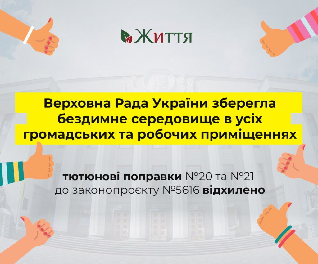 6 вересня 2022 року Верховна Рада України ухвалила законопроєкт №5616 «Про охорону географічних значень сільськогосподарської продукції» та відхилила правки №20 та №21, які подавали тютюнові лобісти. Ми вітаємо всіх і кожного, хто не дозволив повернути куріння в кафе, ресторани та решту громадських та робочих місць.