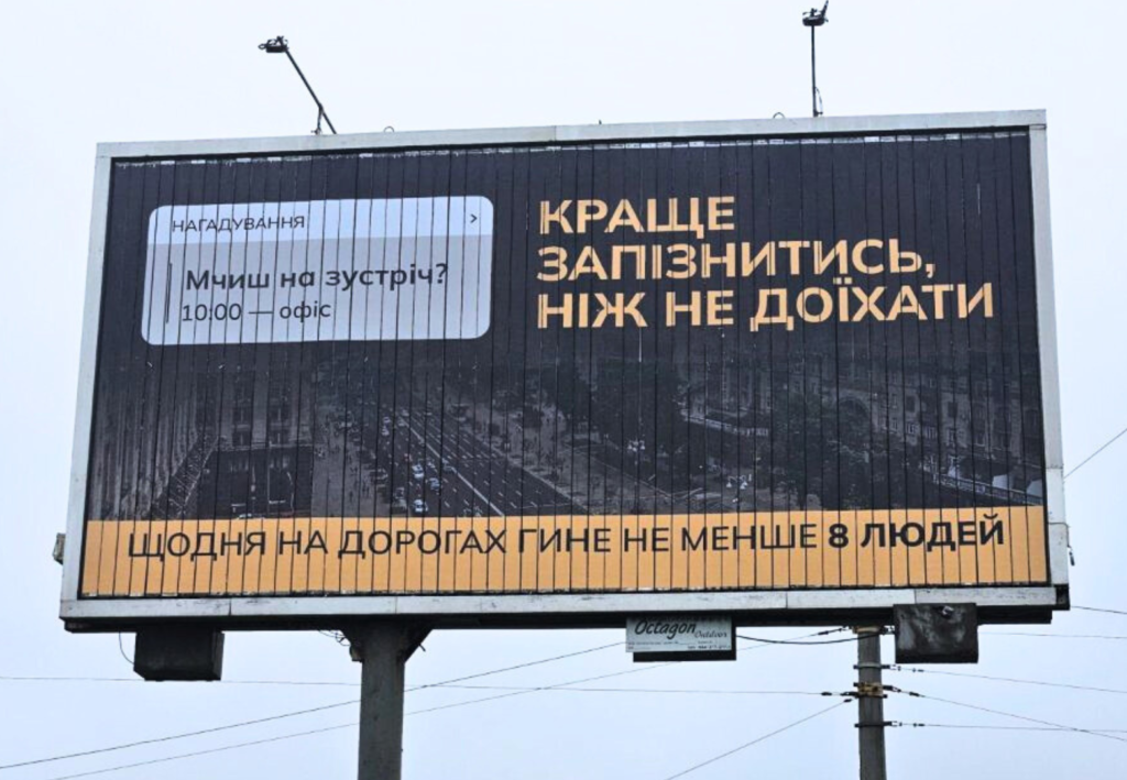 Розробляли ж кампанію “Краще запізнитись, ніж не доїхати” у партнерстві з комунікаційною агенцією pedan buro в рамках Кампанії “За безпечні дороги”. Партнером в розміщенні соціальної реклами в Києві став Octagon Outdoor, національний оператор зовнішньої реклами України.