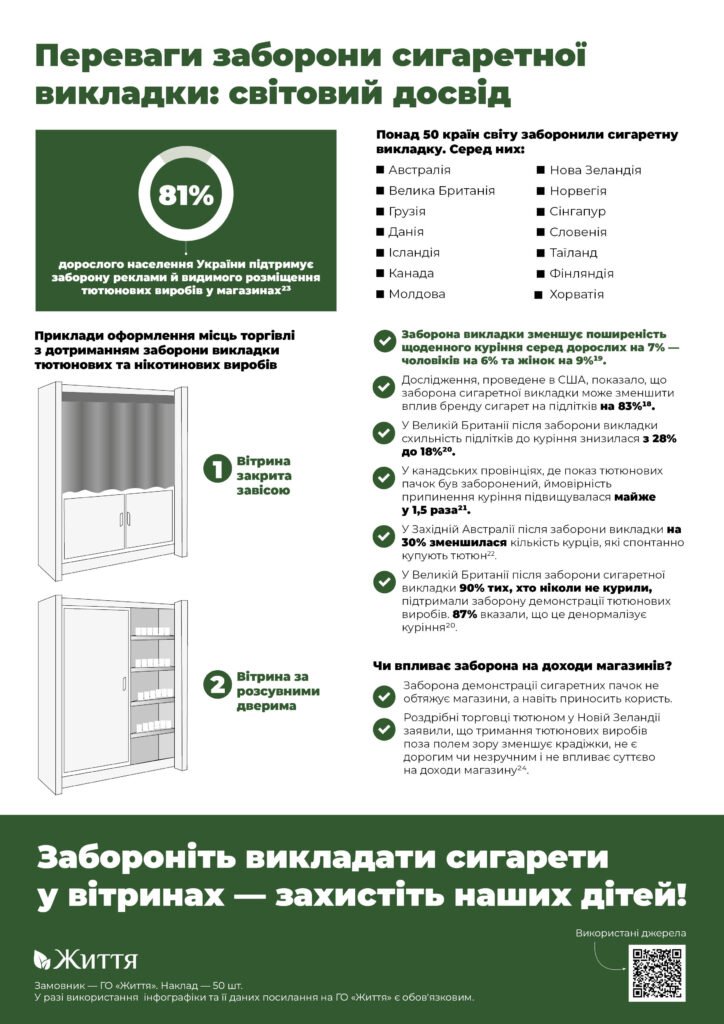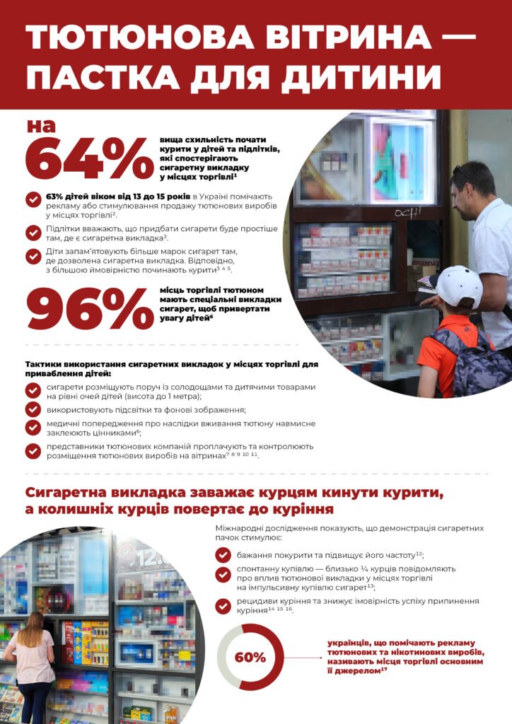 Тому наступним необхідним кроком для України є заборона сигаретної викладки, що на 64% зменшить схильність до початку куріння серед дітей та підлітків.
