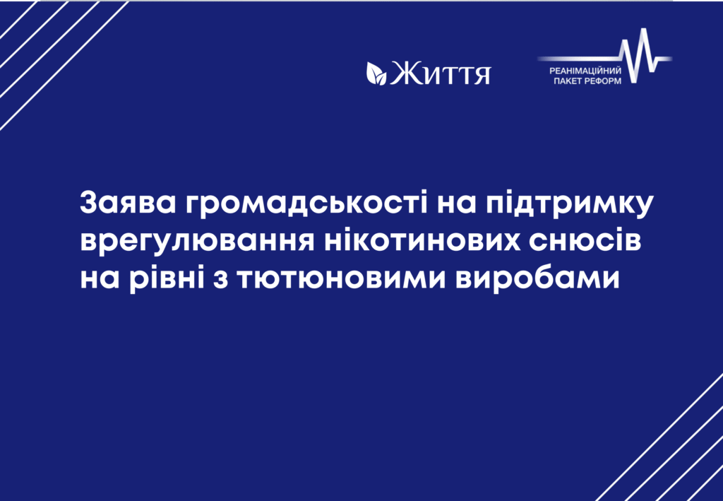 Від імені громадськості, не повʼязаної з тютюновою та алкогольною індустріями, заявляємо про необхідність невідкладного законодавчого врегулювання нікотинових снюсів щонайменше на рівні з тютюновими виробами та закликаємо народних депутатів підтримати за основу законопроєкт №14110-д «Про внесення змін до деяких законів України щодо врегулювання нікотиновмісних продуктів».