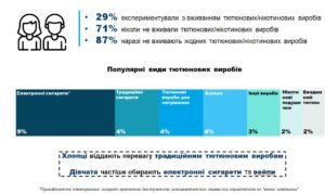 - 9% опитаних вживають електронні сигарети, які є найпопулярнішим видом вживання нікотинових і тютюнових виробів серед підлітків, завдяки їх доступності, різноманітності смаків та оманливому сприйняттю як “менш шкідливих”.