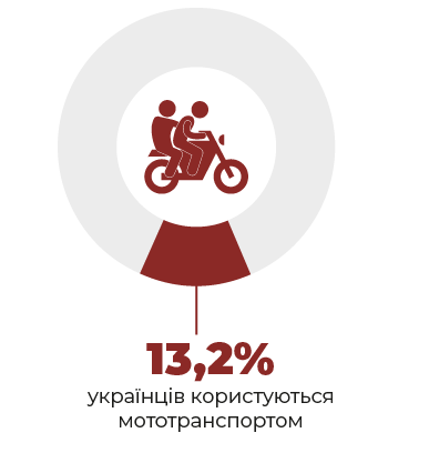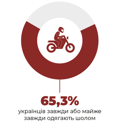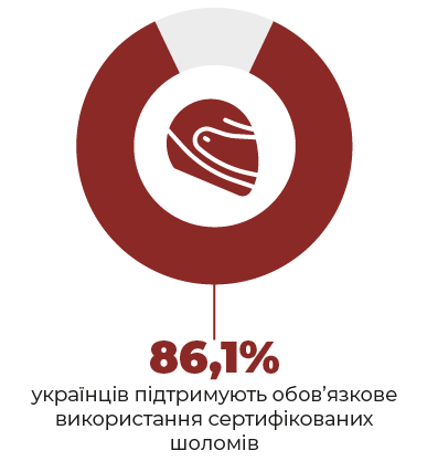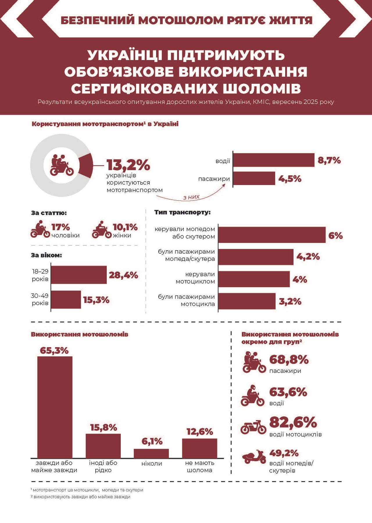 Дослідження показали, що кожен восьмий дорослий користується мототранспортом (13%), при цьому найактивніше його використовує молодь. Більшість українців, зокрема 2/3 водіїв і пасажирів, підтримують запровадження обов’язкового стандарту безпеки для мотошоломів. Ці результати створюють підґрунтя для ухвалення регуляторних змін.