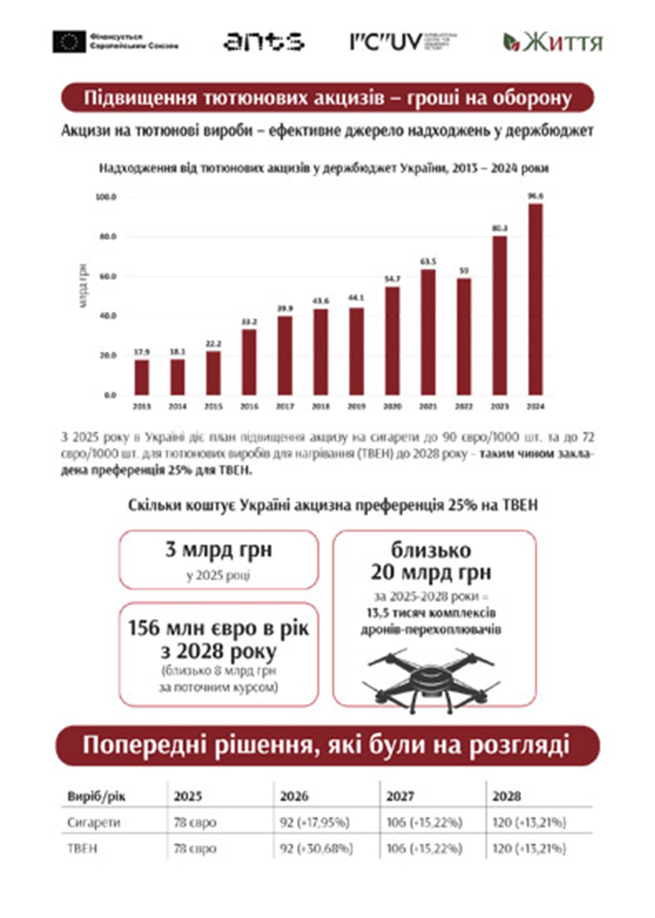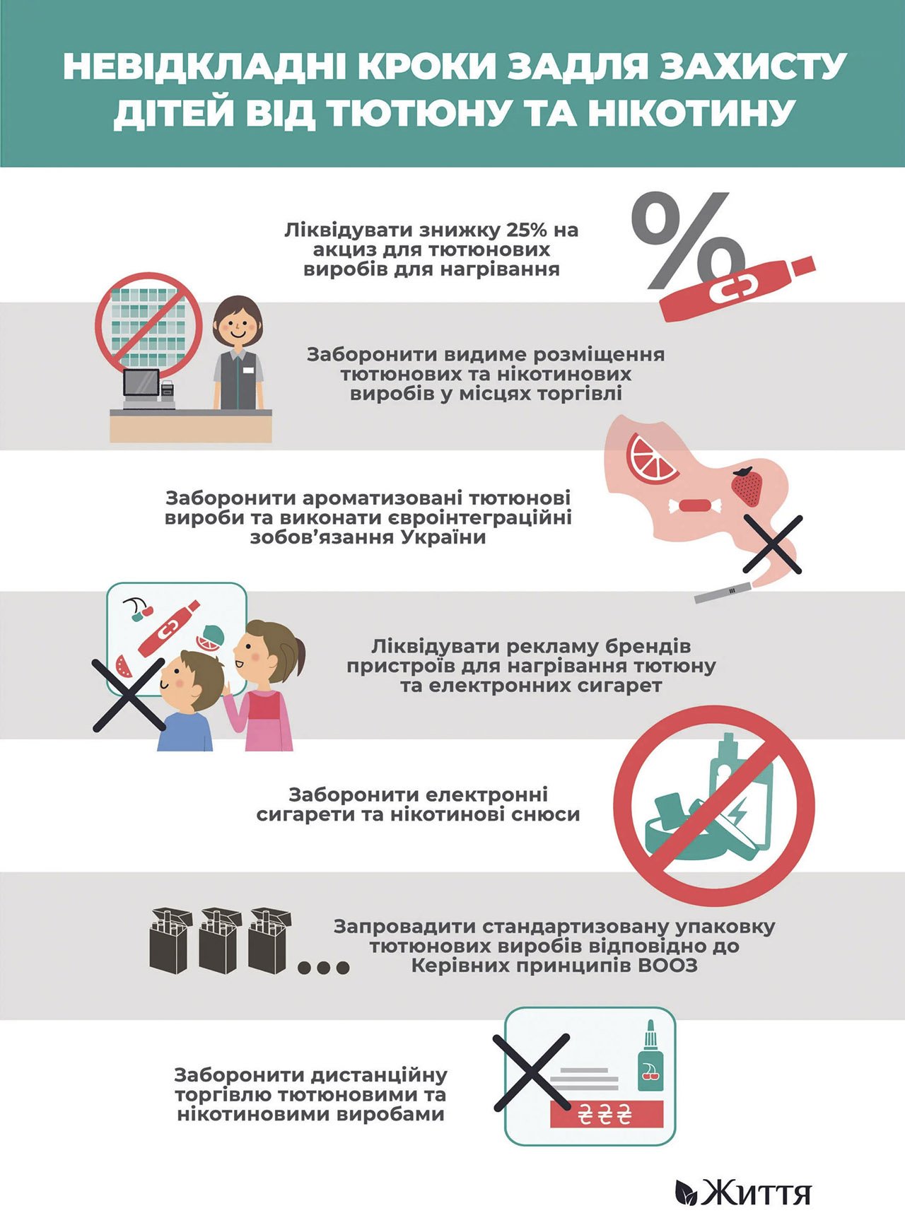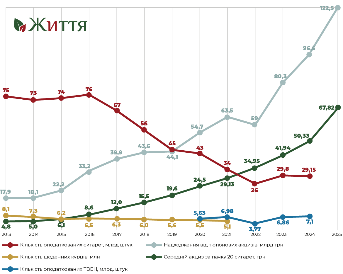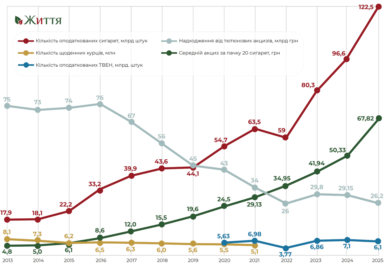 ГО «Життя» системно діє задля зниження цінової доступності тютюнових та нікотинових виробів через підвищення акцизів, що відповідає кращим практикам РКБТ ВООЗ. 25 березня 2025 року набув чинності Закон №4115-IX, норми якого передбачають: