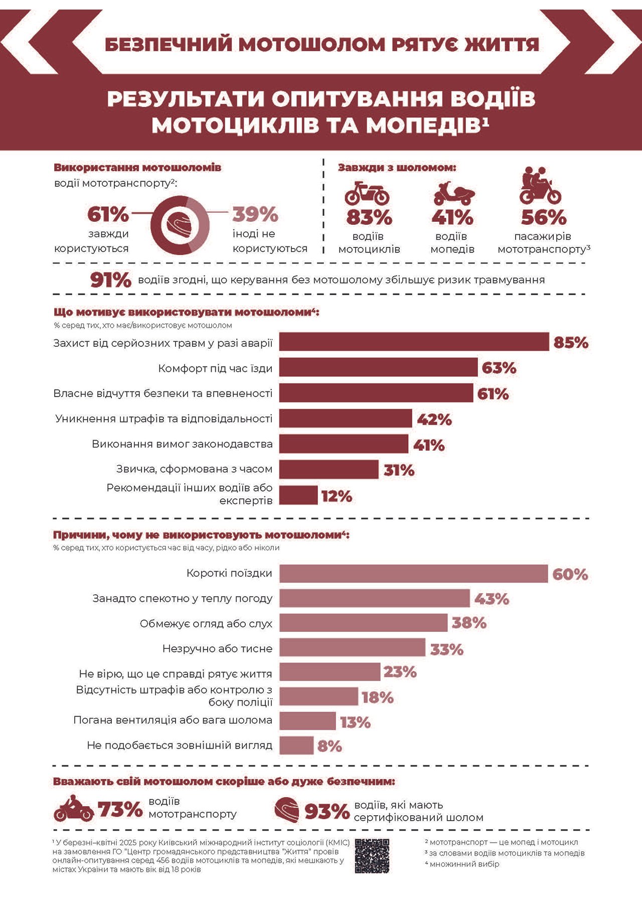 У 2025 році ГО «Життя» презентувала результати двох національних соціологічних опитувань КМІС щодо використання мотоциклів і мопедів та практик користування мотошоломами.