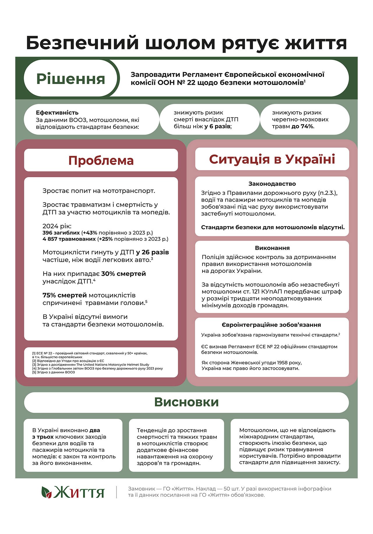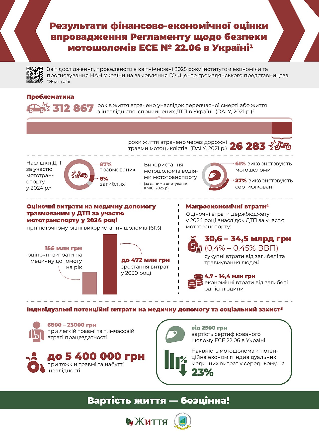 У вересні 2025 року ГО «Життя» презентувала результати унікального дослідження Інституту економіки та прогнозування НАН України щодо економічного ефекту від впровадження європейського стандарту безпеки мотошоломів ECE №22.06. Вперше в Україні науковці порахували, які фінансово-економічні переваги отримає держава від переходу на сертифіковані мотошоломи.