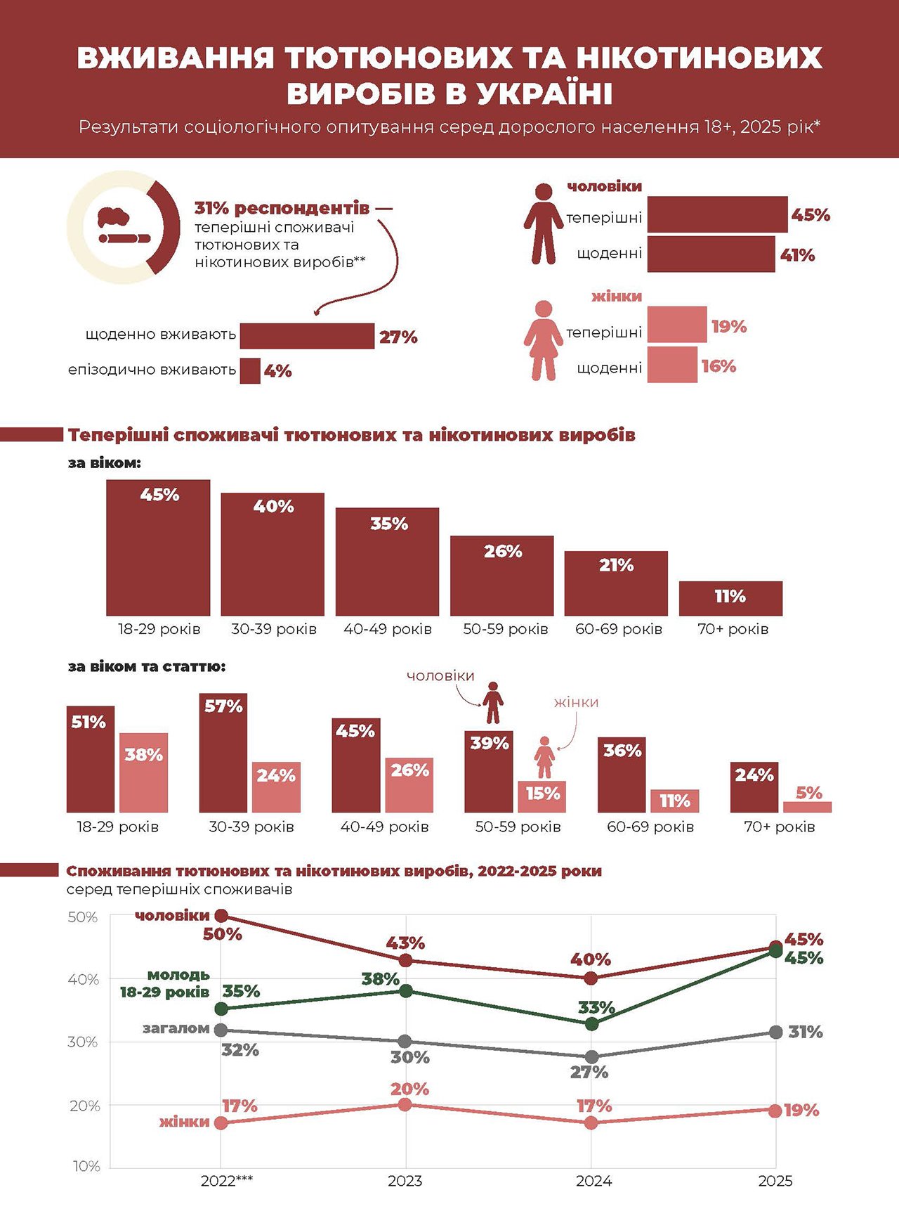 Протягом 2025 року у співпраці з Київським міжнародним інститутом соціології було проведено три всеукраїнських опитування серед дорослого населення України 18 років і старше щодо вживання тютюнових та нікотинових виробів, впливу реклами тютюнових та нікотинових виробів та ставлення до антитютюнових заходів.