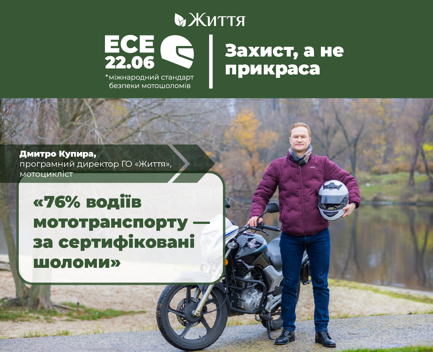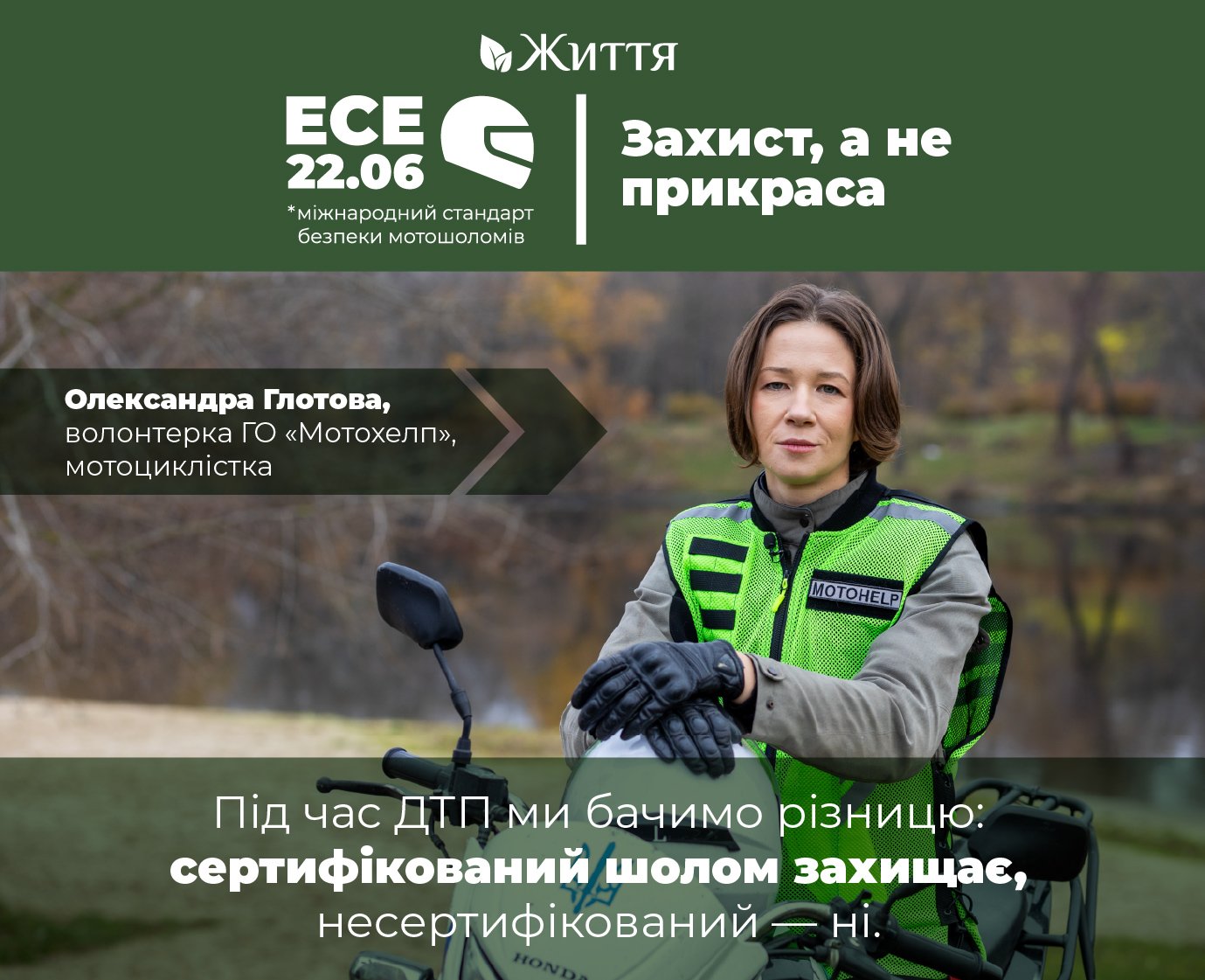 ГО «Життя» провела інформаційну кампанію «Захист, а не прикраса», присвячену впровадженню європейського стандарту безпеки мотошоломів ECE 22.06. Кампанія проводилася у співпраці з ГО «Мотохелп» та пояснювала, що мотошолом — це передусім засіб захисту життя, а не елемент стилю. Амбасадорами кампанії стали лікарі, байкери, інструктори та волонтери, які демонструють власним прикладом важливість використання сертифікованих шоломів і безпечної поведінки на дорозі.