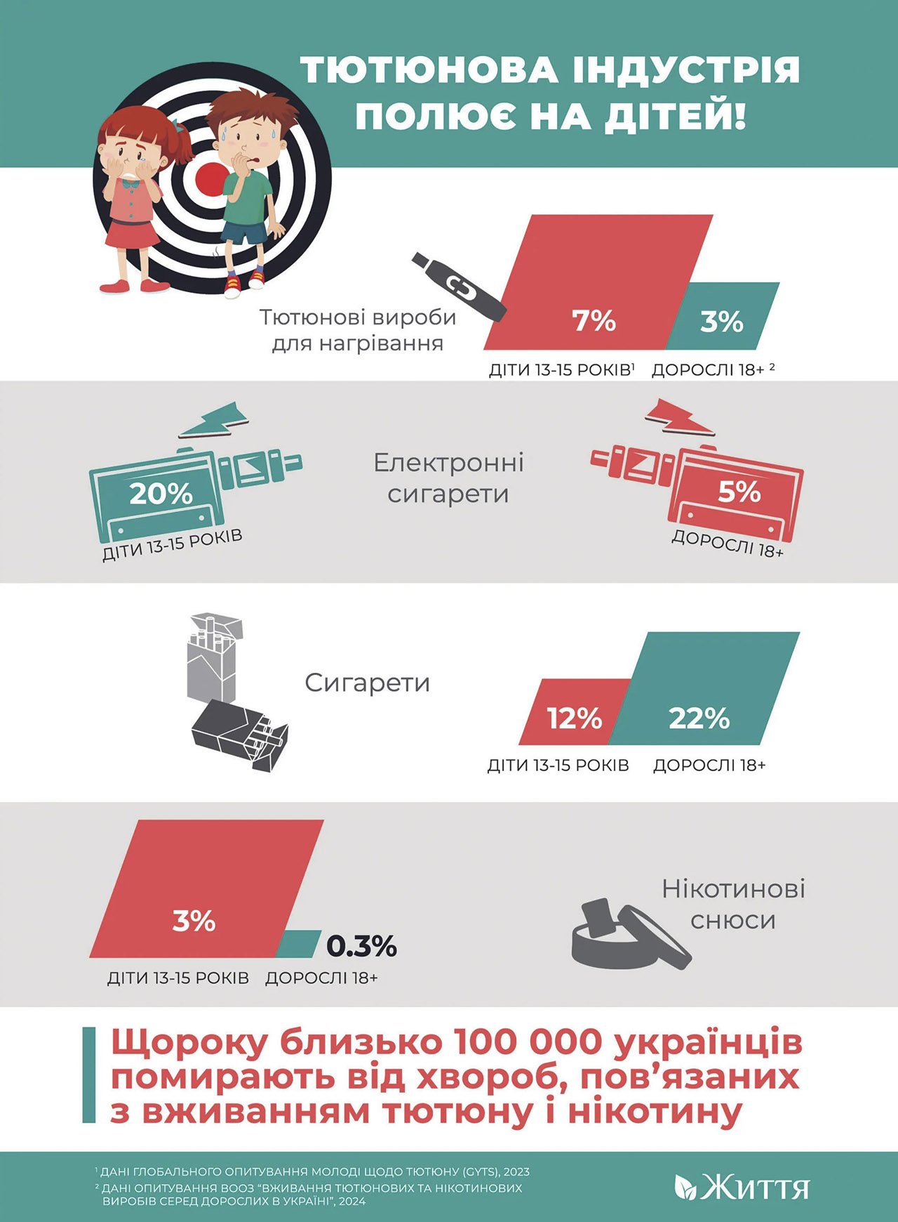 За даними Глобального опитування молоді щодо тютюну, 20% дітей віком 13–15 років в Україні вживають електронні сигарети.