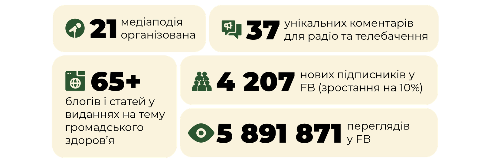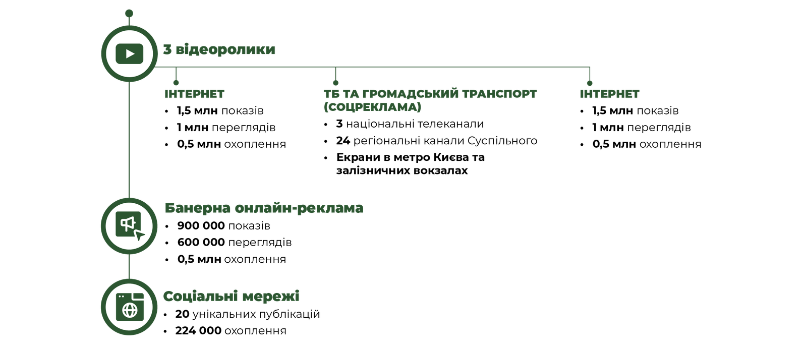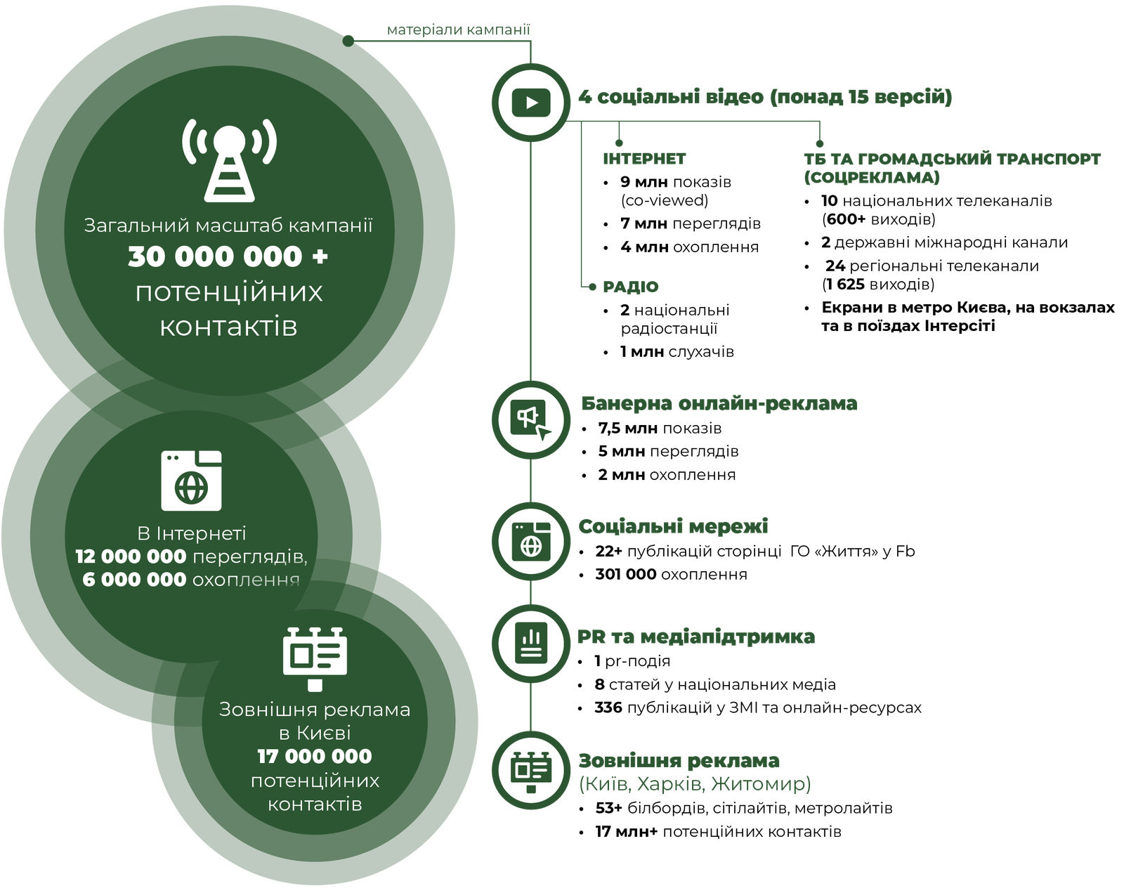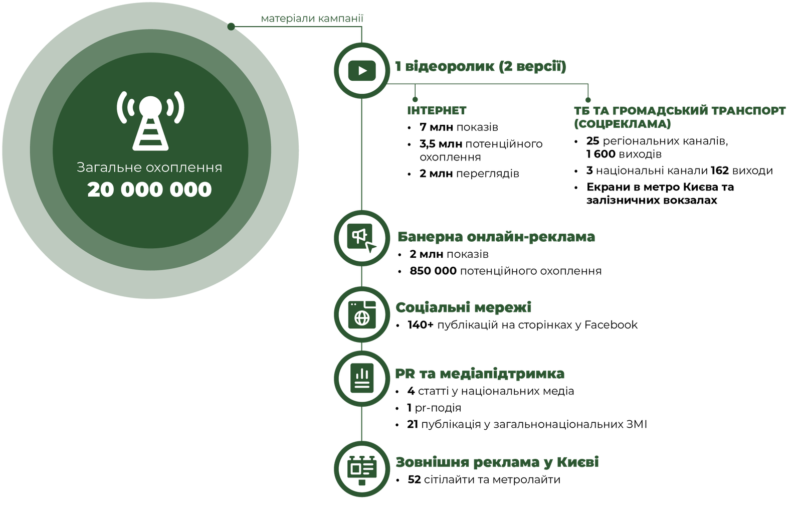 Цифрові канали забезпечили охоплення понад 1,2 млн людей, а реклама на ТБ, радіо та в громадських місцях дозволила значно розширити охоплення до кількох мільйонів контактів.